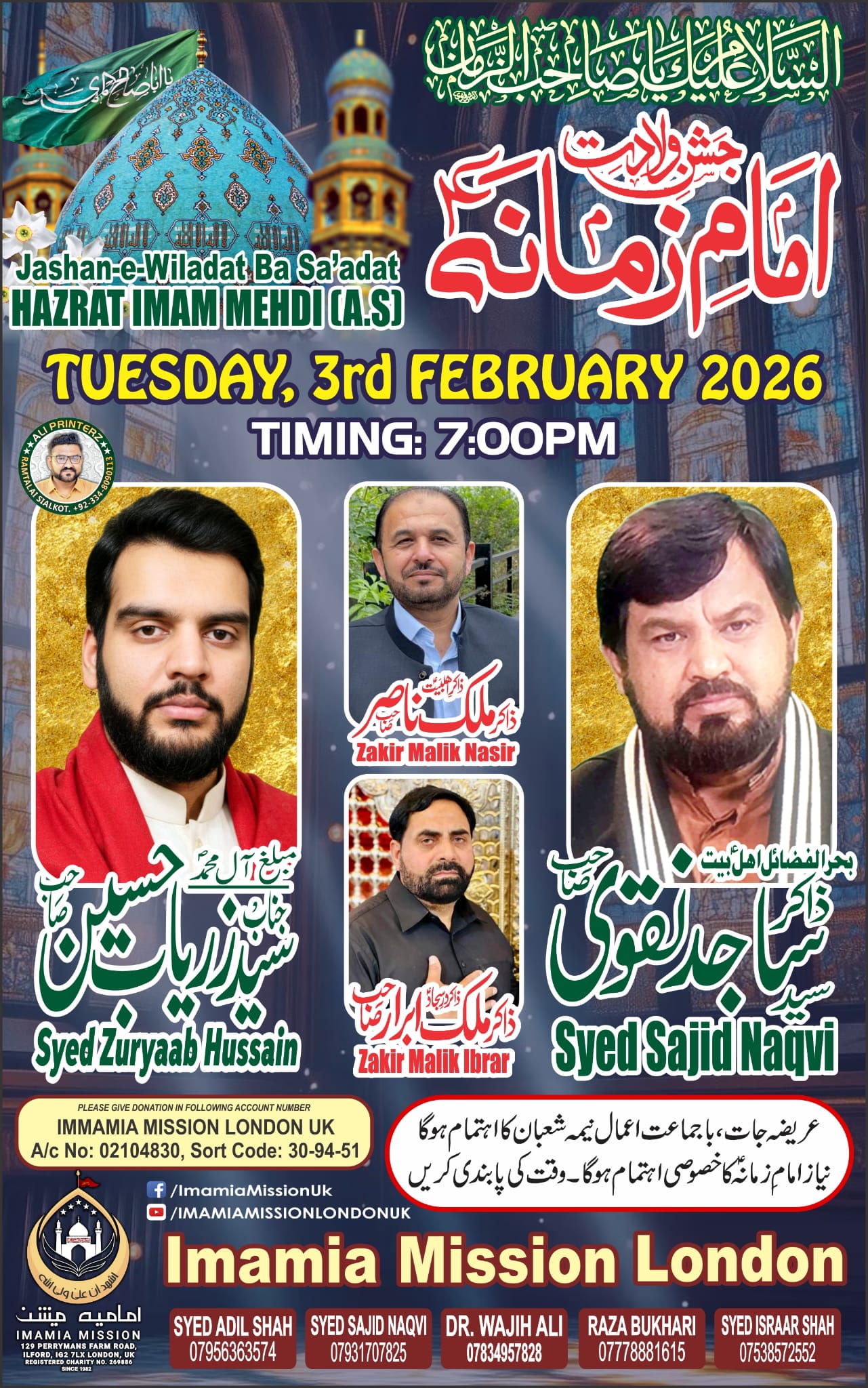 | 03/02/2026 | 14/15 Shabaan | Shabay Bara'at Zahoor Imam Mehdi Sahib Ul Asar Zaman (AS) |