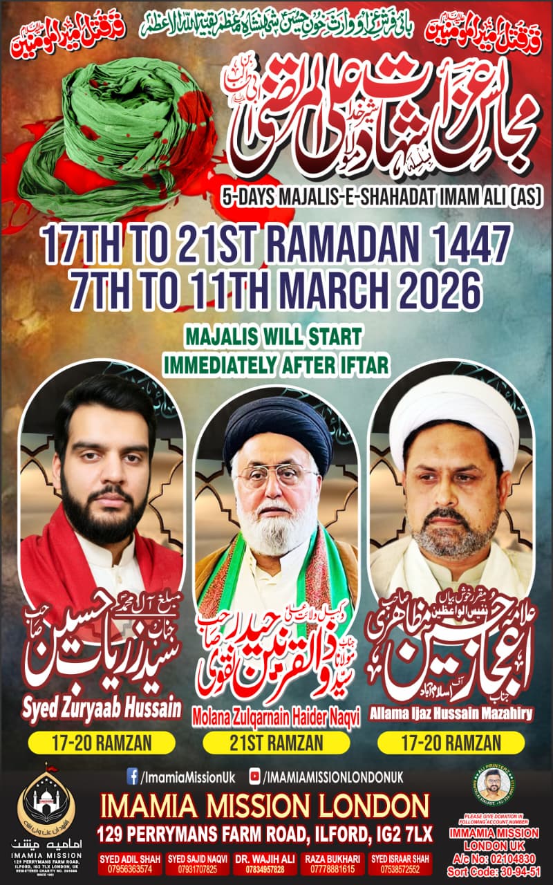 | 09/03/2026 | 19 - 21 Ramadan | Zarbat & Shahadat - Imam Hazrat Ali (AS) |
